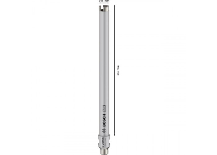 - Алмазна коронка Bosch PRO Core Cutter wet діаметром 25 мм і довжиною 300 мм із посадковим різьбленням 1/2 дюйма розроблена спеціально для ефективного мокрого свердління в бетоні, включно з армованими конструкціями. Це надійне рішення для тих, хто цінує довговічність, високу продуктивність і точність при свердлінні бетону.