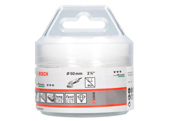 Алмазна коронка Bosch Dry Speed Best for Ceramic діаметром 60 мм (2 3/8 дюйм), з робочою довжиною 35 мм ідеальна для виготовлення отворів у граніті, мармурі, кераміці, в тому числі підлоговій, настінній плитці. Швидкорізальний алмазний різець з тривалим терміном служби має безключове кріплення X-Lock, і застосовується тільки на болгарках з системою X-Lock.