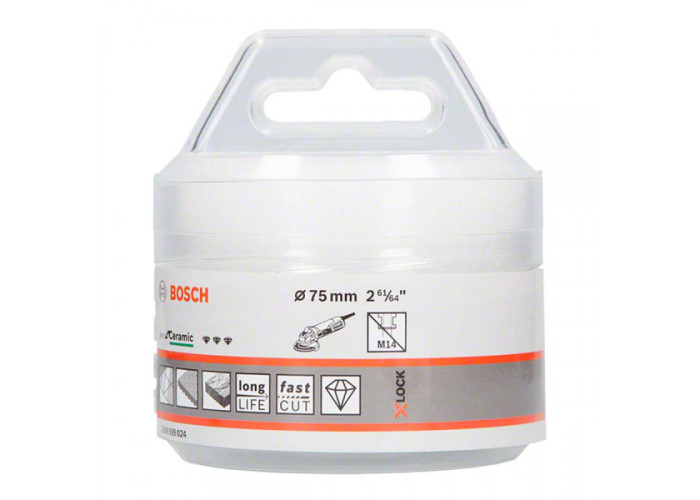 Алмазна коронка Bosch Dry Speed Best for Ceramic діаметром 75 мм (2 61/64 дюйм), з робочою довжиною 35 мм ідеальна для виготовлення отворів у граніті, мармурі, кераміці, в тому числі підлоговій, настінній плитці. Швидкорізальний алмазний різець з тривалим терміном служби має безключове кріплення X-Lock, і застосовується тільки на болгарках з системою X-Lock.