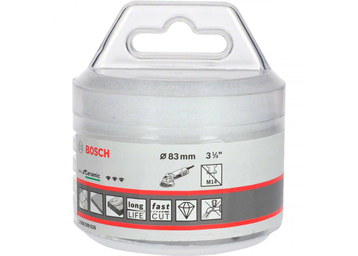 - Алмазна коронка Bosch Dry Speed Best for Ceramic діаметром 83 мм (3 1/4 дюйм), з робочою довжиною 35 мм для виготовлення отворів в мармурі, граніті, кераміці, в тому числі для підлоги та стін плитках, без водяного охолодження.