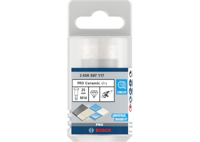 - Алмазне свердло Bosch PRO Ceramic dry — це надійна коронка, розроблена для сухого свердління твердих будівельних матеріалів, включно з цегляною кладкою та керамікою.