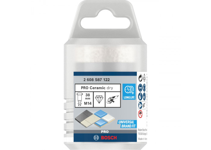Алмазне свердло Bosch PRO Ceramic dry 38x35 мм з посадкою M14 призначене для сухого свердління твердих матеріалів, як-от кераміка та плитка. Завдяки алмазним зернам преміум-класу забезпечує високу міцність, точність і тривалий термін служби. Сумісно з кутовими шліфувальними машинами з різьбленням 22.23 мм, підходить для професійного застосування.