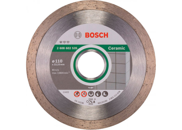 Алмазний відрізний диск Bosch Professional for Ceramic діаметром 110 мм, з посадковим отвором 22,23 мм, висотою сегментів 7,5 мм і шириною розпилу 1,6 мм. Економний універсальний варіант для різання плитки.