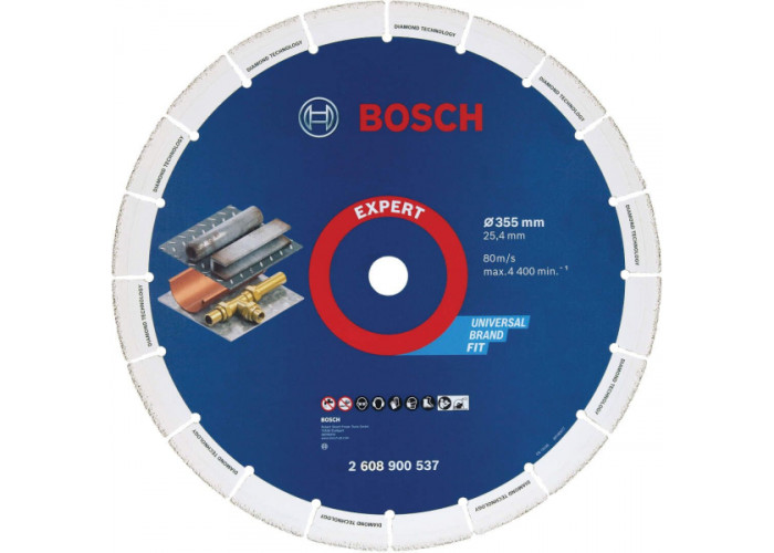 Алмазный диск Bosch Expert for Metal диаметром 355 мм, посадка 25 мм. Применяется для отрезных работ по различным металлам.