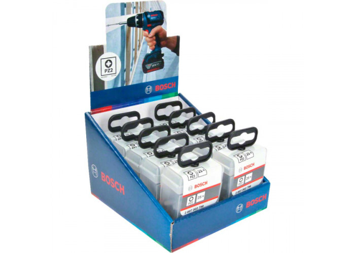 - 25 високоякісних насадок-біт Bosch Extra Hard з шліцом Pozidriv 2 (PZ2) для загвинчування без пошкодження поверхні.