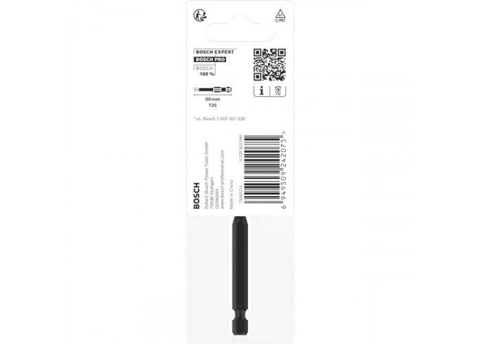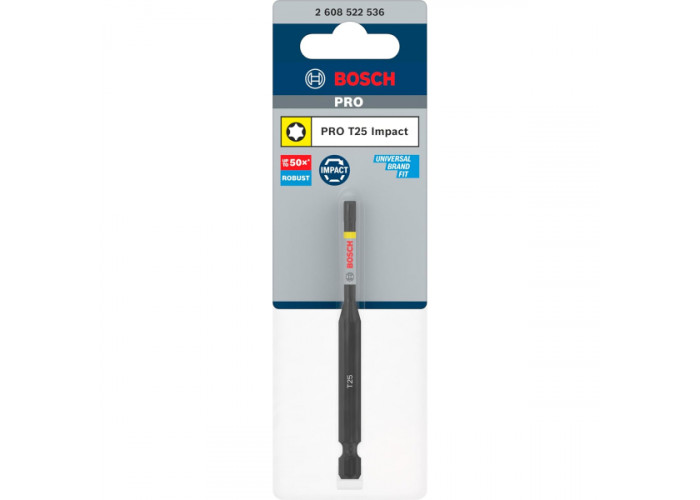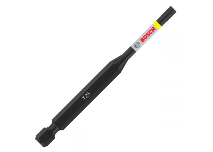 - Біта Bosch Pro Torx Impact T25 довжиною 90 мм — це професійний інструмент, розроблений спеціально для важких монтажних робіт із високим рівнем навантаження. Вона призначена для надійного закручування шурупів із головкою Torx у найвимогливіших умовах, включно з використанням з ударними шурупокрутами та гайковертами.