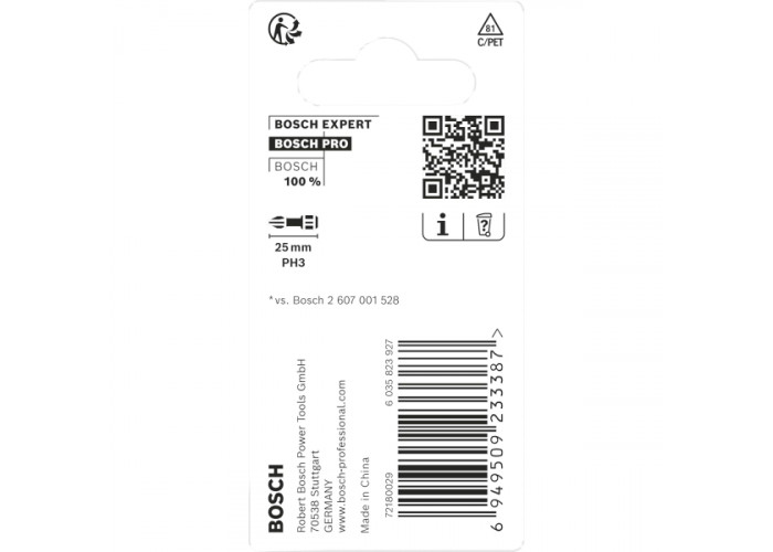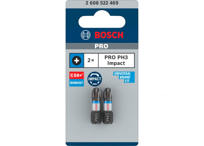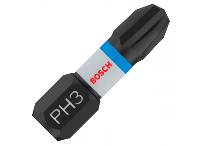 - Біти Bosch Pro Phillips Impact PH3 довжиною 25 мм — це професійні інструменти, розроблені спеціально для важких монтажних робіт із високим рівнем навантаження. Вони призначені для надійного закручування шурупів із голівкою Phillips у найвимогливіших умовах, включно з використанням з ударними шуруповертами та гайковертами.