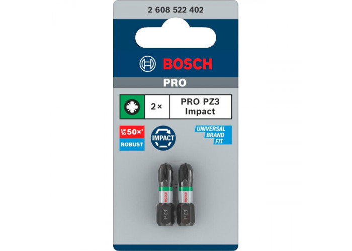 - Біти Bosch Pro Pozidriv Impact PZ3 довжиною 25 мм — це професійні інструменти, розроблені спеціально для важких монтажних робіт із високим рівнем навантаження. Вони призначені для надійного закручування шурупів із голівкою Pozidriv у найвимогливіших умовах, включно з використанням з ударними шуруповертами та гайковертами.