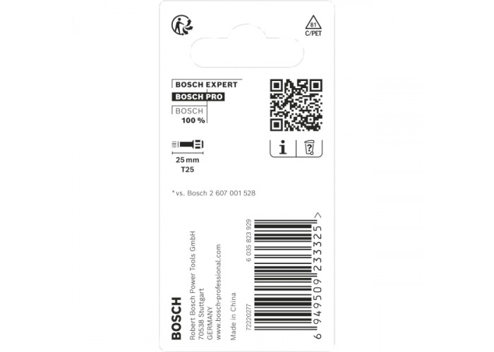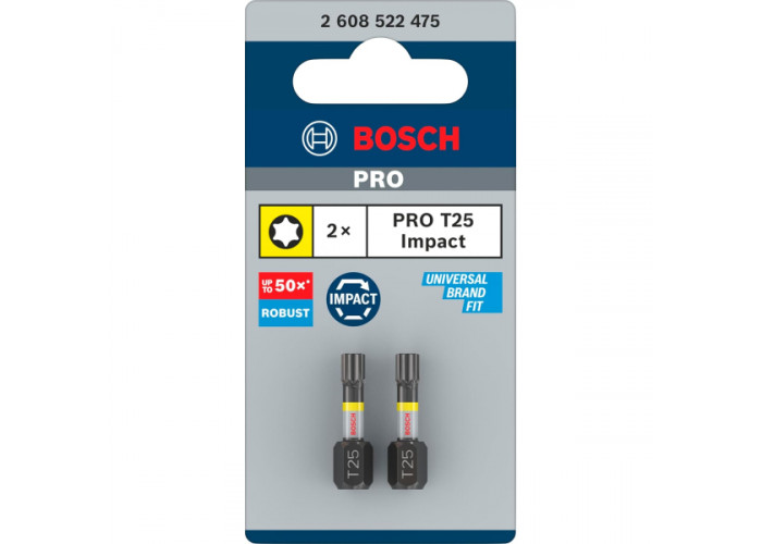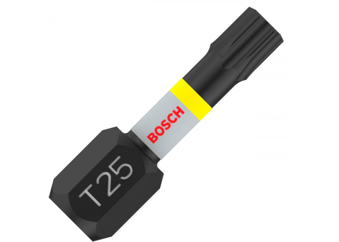 - Біти Bosch Pro Torx Impact T25 довжиною 25 мм — це професійні інструменти, розроблені спеціально для важких монтажних робіт із високим рівнем навантаження. Вони призначені для надійного закручування шурупів із головкою Torx у найвимогливіших умовах, включно з використанням з ударними шурупокрутами та гайковертами.