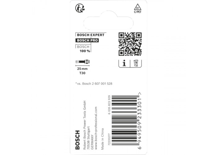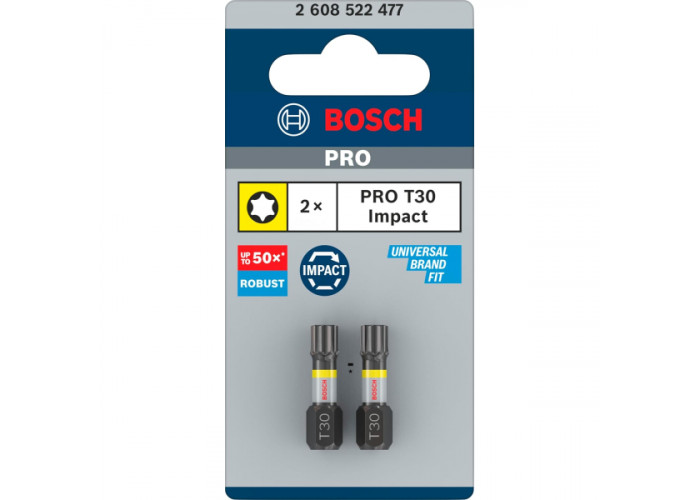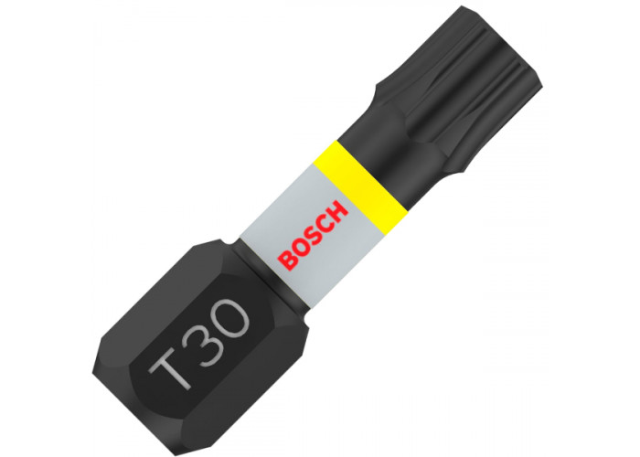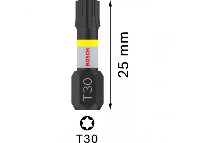 - Біти Bosch Pro Torx Impact T30 довжиною 25 мм — це професійні інструменти, розроблені спеціально для важких монтажних робіт із високим рівнем навантаження. Вони призначені для надійного закручування шурупів із головкою Torx у найвимогливіших умовах, включно з використанням з ударними шурупокрутами та гайковертами.