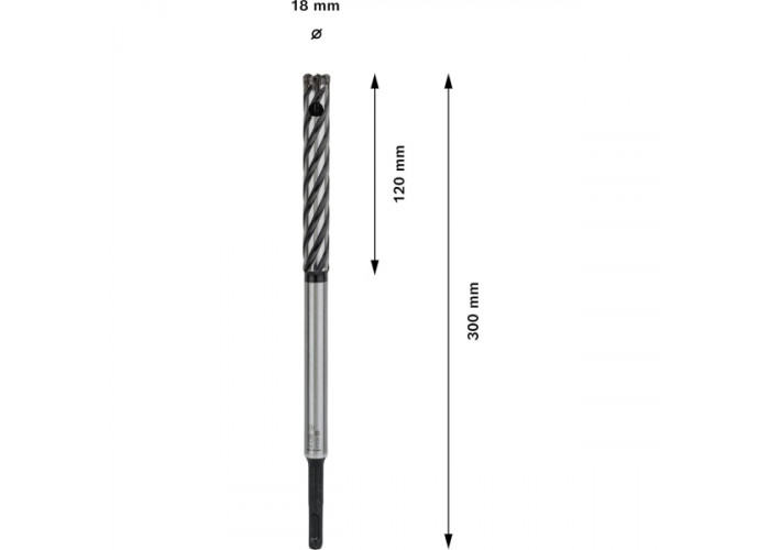 - Діаметр 18 мм, робоча довжина 120 мм і загальна довжина 300 мм дають змогу виконувати глибокі прорізи та забезпечують стабільність у процесі свердління.