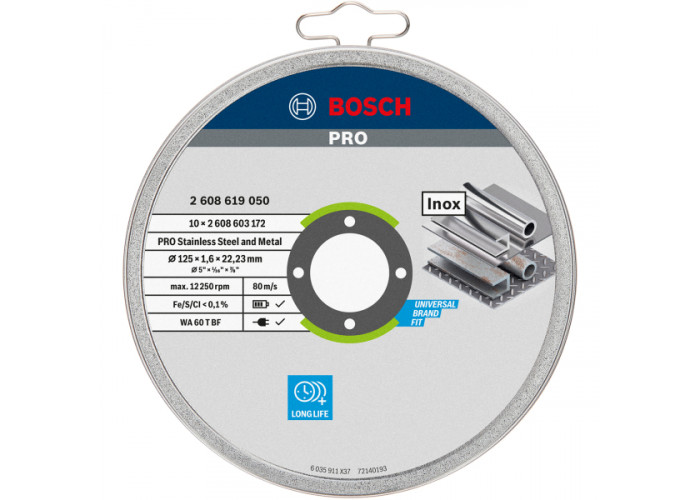 Bosch Standard for Inox отрезной диск диаметром 125 мм, толщиной 1.6 мм с посадкой 22.23 мм специально разработан для резки нержавеющей стали. Скорость вращения 12250 об/мин. Количество в упаковке 10 шт.