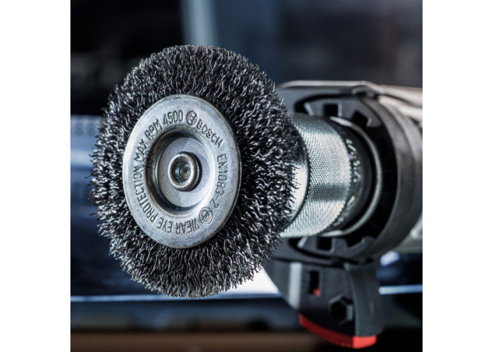 - Дискова щітка Bosch PRO Metal clean діаметром 50 мм із дротом товщиною 0,2 мм ідеальна для очищення сталевих виробів. Підходить для обробки зварних швів, куточків, складних ділянок. Відмінно видаляє стару фарбу або інші покриття, корозію. Особливо практична для обробки дрібних деталей, роботи у важкодоступних місцях.
