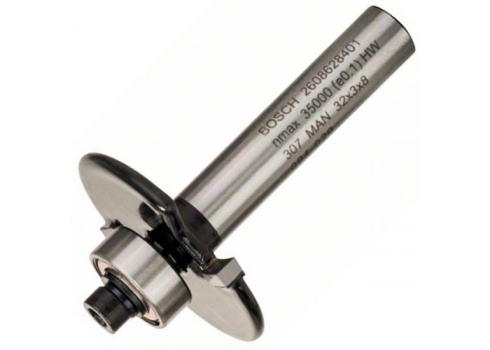 Твердосплавна плоска пазовая фреза з хвостовиком 8 мм, діаметром 32 мм, загальною довжиною 51 мм і робочою — 3 мм, з двома лезами і шарикопідшипником для виготовлення пазів у вузьких кромках деревини та листового матеріалу. Робоча насадка до вертикально-фрезерних машин.