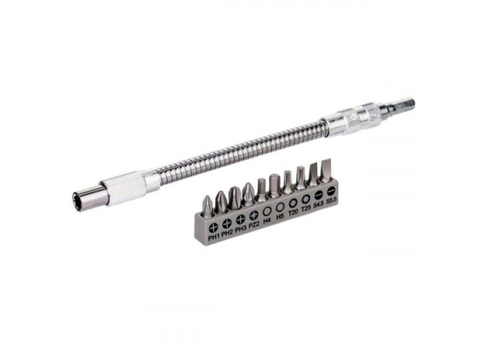Гнучкий металевий подовжувач Bosch SDB HEX ¼ дюйма, довжиною 200 мм і набір 10 насадок-біт для загвинчування кріпильних елементів у важкодоступних місцях.