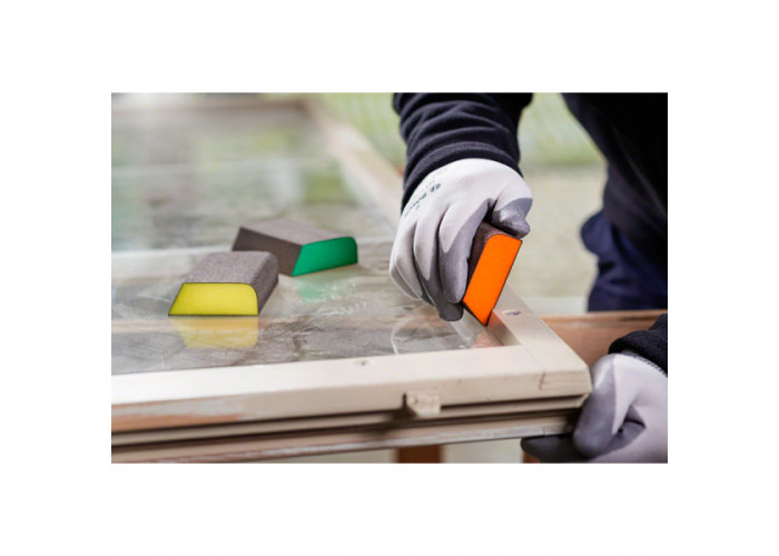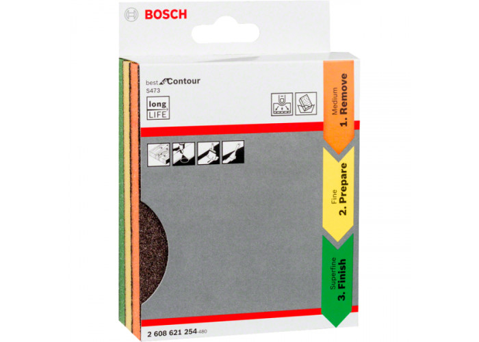 - У наборі Ви знайдете три губки Bosch S473 Best for Contours розміром 98x120x13 мм з різним розміром абразивних зерен: середній (М), дрібний (F), дуже дрібний (SF).