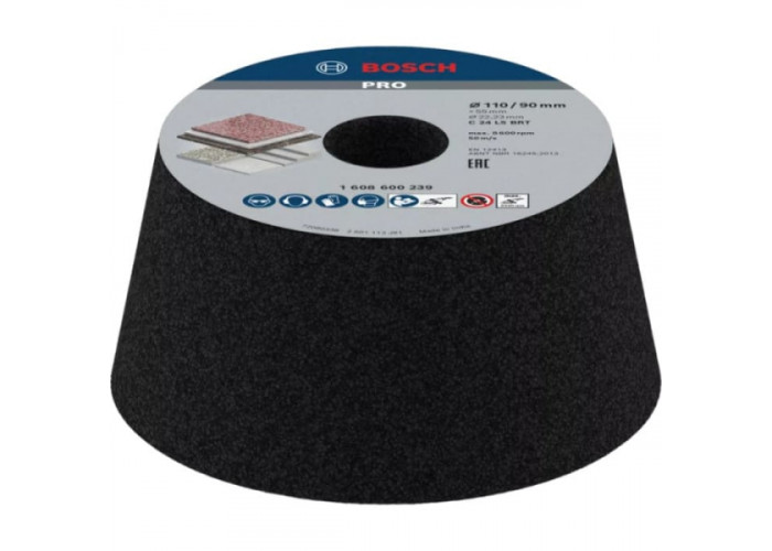 Шліфувальна чашка Bosch PRO Stone використовується зі шліфмашинами для грубого шліфування заготовок з каменю. Має конічну форму діаметром 110/90 мм, товщиною 55 мм з отвором для посадки 22,23 мм і зерном G24.
