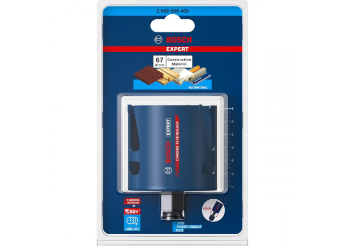 Професійна твердосплавна коронка Bosch Expert Construction Material призначається для роботи по деревині, пластмасі, цеглі, м'якій плитці та ДСП. Має діаметр 67 мм, загальну довжину 60 мм. Кріплення безінструментальне, приєднується до адаптера Power Change Plus.