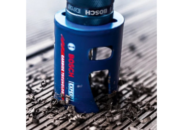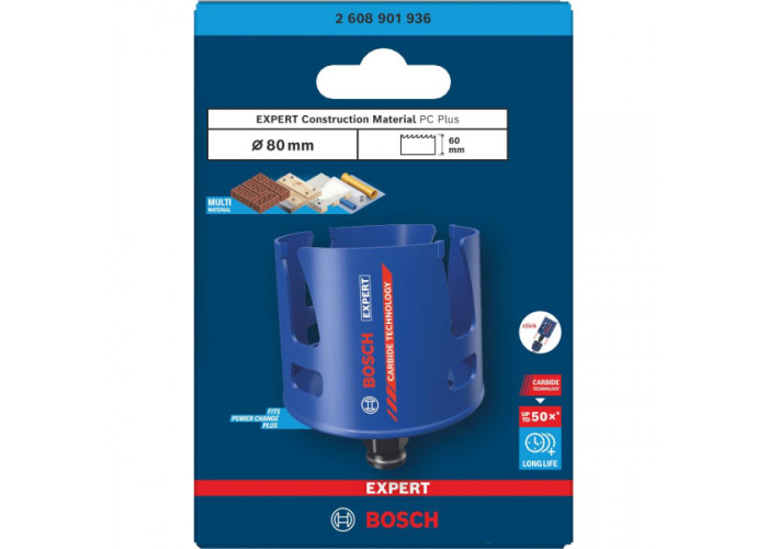 - Коронка Bosch EXPERT Construction Material Power Change Plus Hole Saw 80х60 мм призначена для свердління точних отворів у будівельних матеріалах середньої та високої щільності - волокнистому пластику, ДСП, м'якій деревині, м'якій керамічній плитці та цеглі.