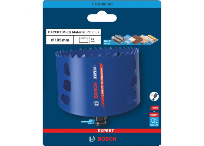 - Коронка Bosch EXPERT Multi Material Power Change Plus Hole Saw призначена для свердління точних і чистих отворів у різних матеріалах - від деревини і пластику до гіпсокартону і тонкого металу.