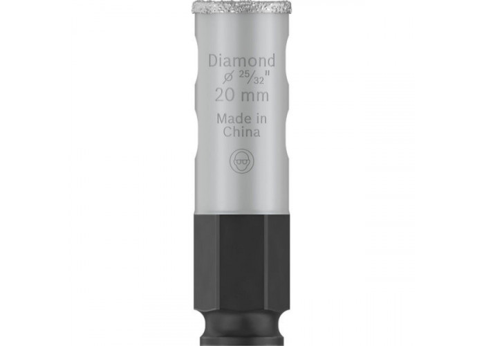 - Насадка діаметром 20 мм забезпечує високопродуктивне свердління отворів у твердій плитці, камені та склі.