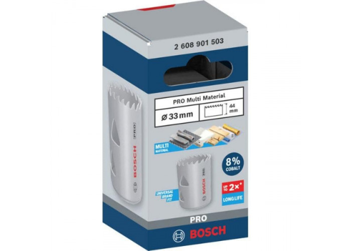 - Коронка Bosch PRO Multi Material - універсальна насадка для висвердлювання отворів у різних матеріалах, зокрема деревині, пластику, гіпсокартоні, металі. Коронка виконана з інструментальної сталі високої міцності, а також має поліпшену форму зубів для ефективного різу.