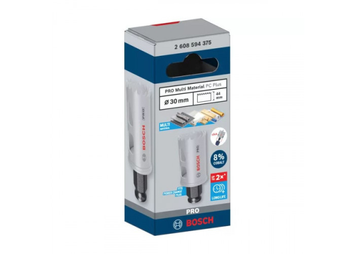 Універсальна коронка Bosch PRO Multi Material PC Plus з Bi-Metal зубцями зі швидкорізальної сталі HSS з 8% додаванням Cobalt. Має діаметр 30 мм і робочу довжину 44 мм. Ріже металеві труби та профілі, кольорові метали, м'яку деревину, пластик і гіпсокартон. Кріплення Power Change Plus.