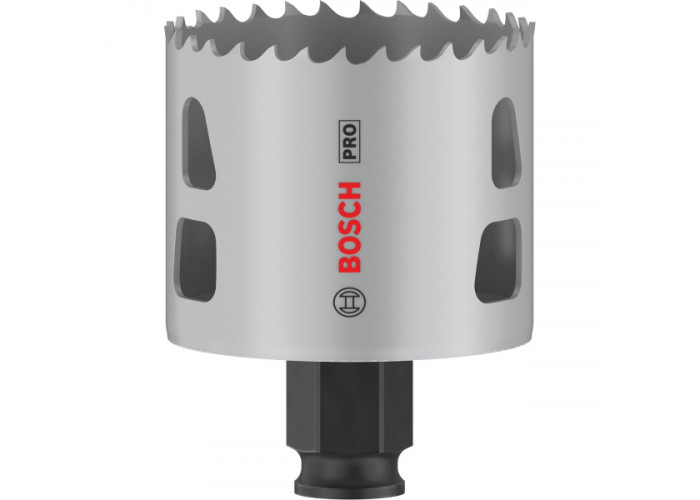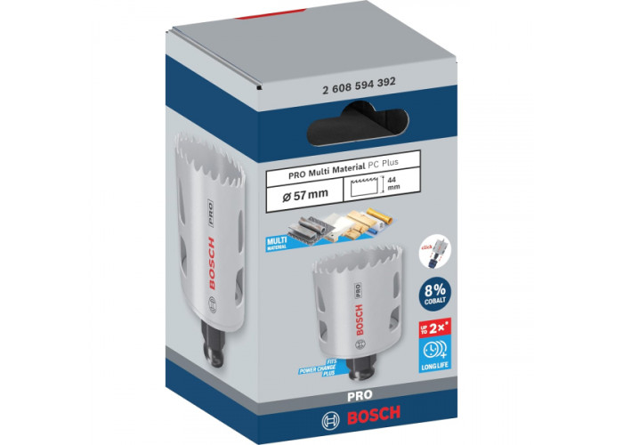 - Bosch PRO Multi Material PC Plus – універсальна насадка для висвердлювання отворів в різних матеріалах, зокрема деревині, пластику, гіпсокартоні, металі. Коронка виконана з інструментальної сталі високої міцності, а також має поліпшену форму зубів для ефективного різу.