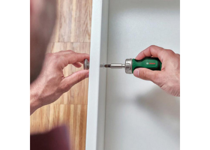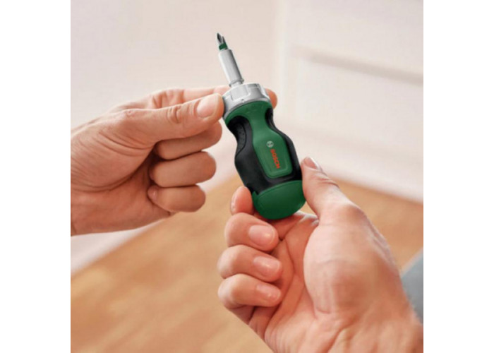 Коротка викрутка Bosch з храповиком та 6-ма бітами експлуатується в умовах обмеженого простору. Завдяки використанню храпового механізму забезпечується ефективна робота з елементами кріплення. Змінні біти підходять для різних типів кріплення.