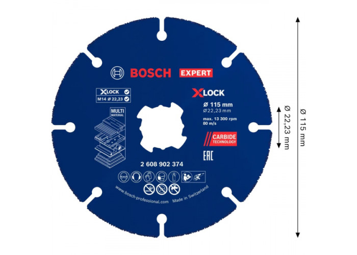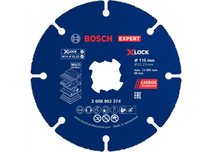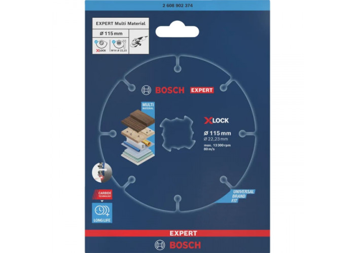 Міцний сегментний диск Bosch Expert Carbide Multi Material працює з деревиною, зокрема із цвяхами, пластмасами. Діаметр відрізного круга дорівнює 115 мм, посадковий отвір — 22.23 мм. Кріпиться тільки до болгарок із системою X-Lock. Кількість обертів сягає 13300 об/хв.