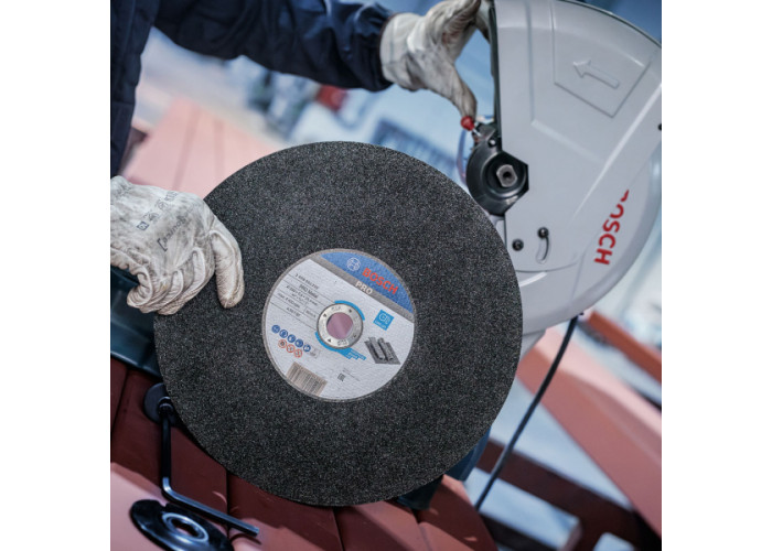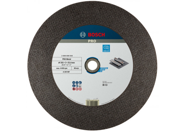 Відрізний круг Bosch Expert for Metal прямий форми діаметром 355 мм, з посадкою 25,4 мм, товщиною 3 мм застосовується на стаціонарних маятникових відрізних шліфмашинах для якісного різання металу. Два зовнішніх шару армуючої тканини. Максимальна робоча потужність 3 PS/2,4 кВт. Окружна швидкість круга 80 м/с.