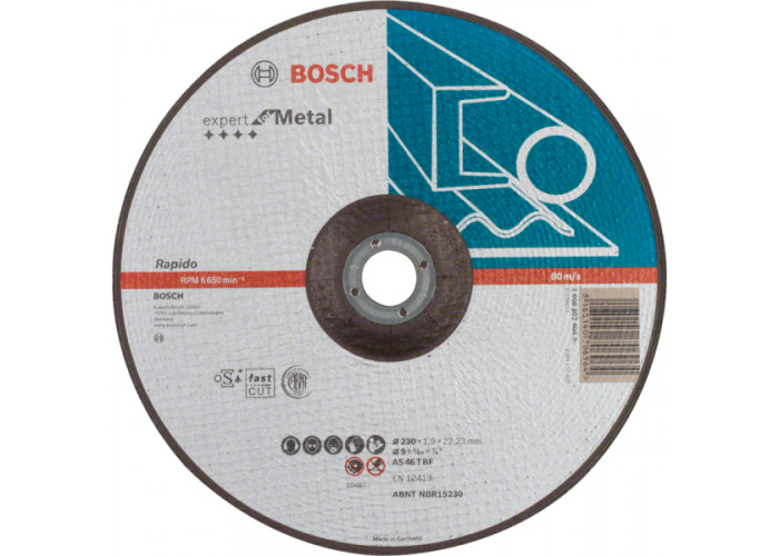 Відрізний круг Bosch Expert for Metal випуклої форми діаметром 230 мм, з посадкою 22,23 мм, товщиною 1,9 мм застосовується на кутових шліфувальних машинах Bosch 230 мм для чистої різання металу без утворення задирок і зміни кольору заготовки. Частота обертання 6650 об/хв.