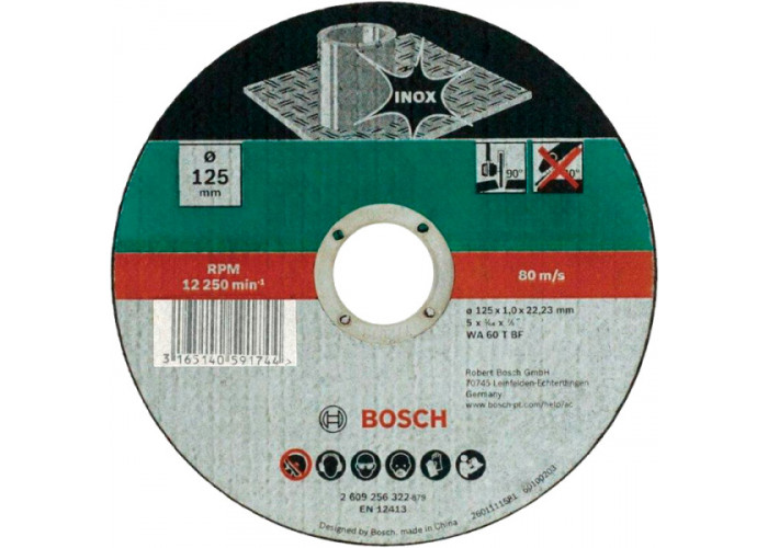- Прямой отрезной круг Bosch WA 60 T BF диаметром 125 мм, толщиной 1,6 мм, с посадкой 22,23 мм предназначен для резки нержавеющей стали.