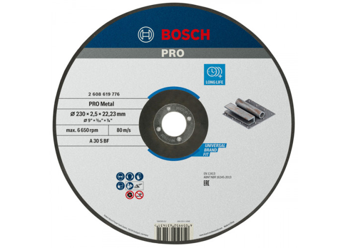 - Диск відрізний Bosch PRO Metal опуклої форми діаметром 230 мм, товщиною 2.5 мм, з посадкою 22.23 мм призначений для різання металевих деталей, труб, профілів та інших металевих виробів. Він підходить для використання як у професійних цілях, так і для домашнього використання.