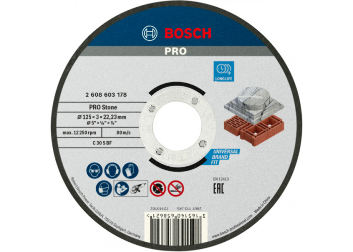 - Відрізний круг Bosch PRO Stone прямої форми діаметром 125 мм, з посадкою 22,23 мм, товщиною 3 мм.