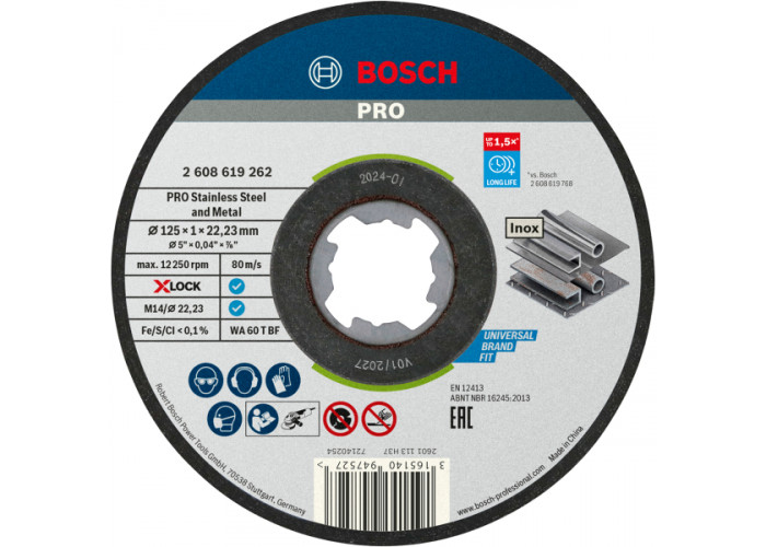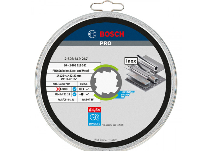 - Прямой отрезной круг Bosch X-Lock PRO Stainless Steel and Metal диаметром 125 мм, толщиной 1 мм, с посадкой 22,23 мм быстро и чисто режет металл и нержавеющую сталь.