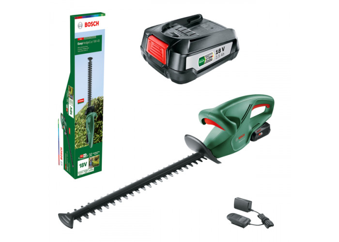 Кусторез Bosch Easy HedgeCut 18-45 | Аккумулятор PBA 18V 2.0Ah (1 шт) |Аккумулятор Bosch Li-Ion PBA 18 V 2,5 Ah W-B (1 шт) | Зарядное устройство AL 1810 CV | Защита для ножей | Коробка