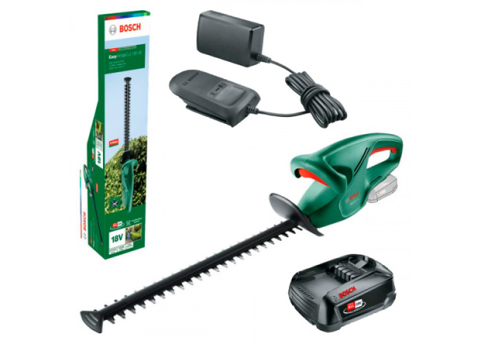 Продуктивний кущоріз Bosch Easy HedgeCut 18-45 приводиться у дію від літій-іонного акумулятора на 18 В. Антиблокувальна система дає змогу безперервно одне за одним зрізати гілки дерев і кущів діаметром до 15 мм. Довжина різальної кромки становить 45 см. Розвиває електроінструмент (вагою 2.5 кг) до 2400 ход/хв. Доставляється в картонній упаковці з акумулятором PBA 18V 2.5Ah і зарядним пристроєм AL 18V-20.