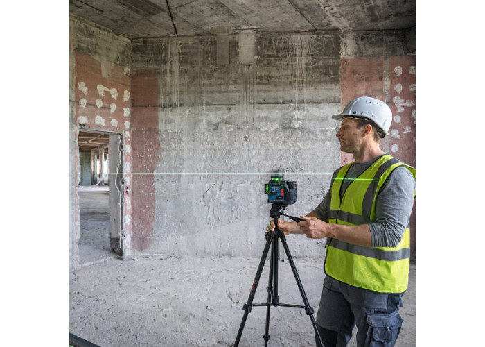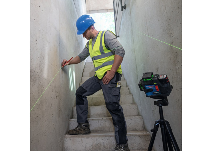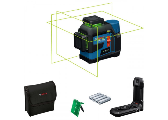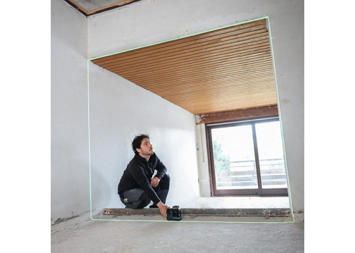 - Прилад оснащений трьома зеленими лазерними лініями з охопленням по 360°, що дає змогу виконувати повне нівелювання за горизонталлю та вертикаллю. Зелений лазерний промінь забезпечує до чотирьох разів кращу видимість порівняно з червоним, особливо на яскраво освітлених об'єктах.