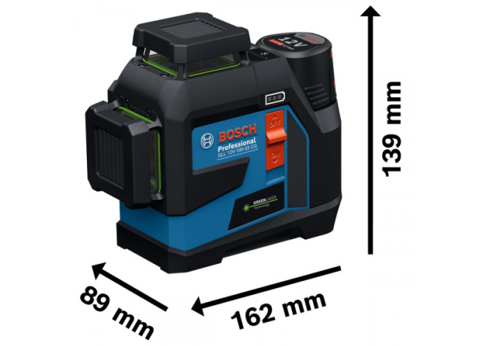 - GLL 12V-100-33 CG вирізняється зручним та інтуїтивним керуванням завдяки вдосконаленій клавіатурі та великому індикатору рівня заряду. Можливість дистанційного керування за допомогою додатка Levelling Remote спрощує роботу і збільшує точність при виконанні завдань, дозволяючи управляти лазерними лініями без прямого контакту з приладом.