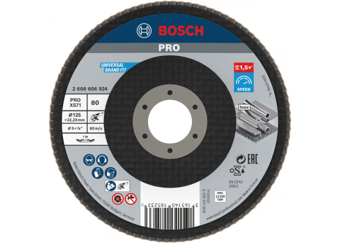 Складчастий шліфкруг Bosch X571, Best for Metal діаметром 125 мм, з посадкою 22,23 мм, з корундовим зерном 80 обробляє метали, що містять залізо. Непрямий.