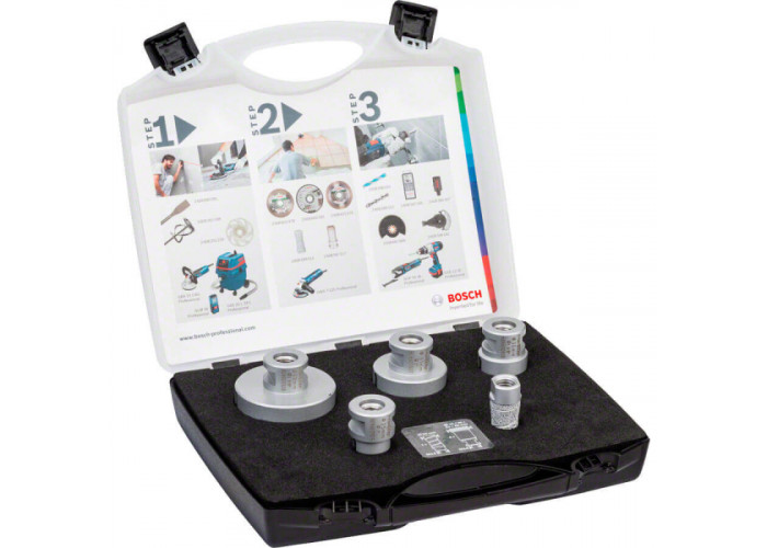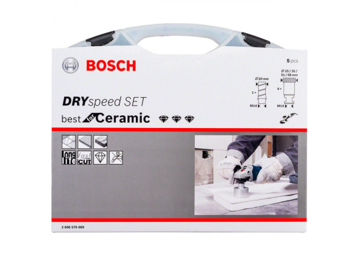 Набір алмазних коронок Bosch Dry Speed складається із 4 коронок і 1 фрези, які просвердлюють отвори в плитці. Діаметри коронок — 28, 38, 51 і 68 мм. Довжина робочої частини змінних пиляльних коронок по 33 мм. Фрезерна головка діаметром 20 мм. Розмір шпинделя — М14.