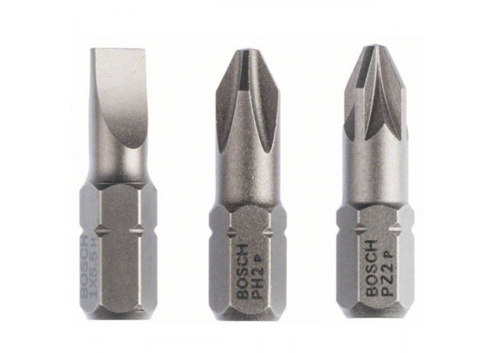 - Набор бит Bosch Extra Hart S1х5,5, PH2, PZ2, 25 мм состоит из 3 насадок (для разных головок). Они идеально подходят к шуруповертам, дрелям от Bosch.