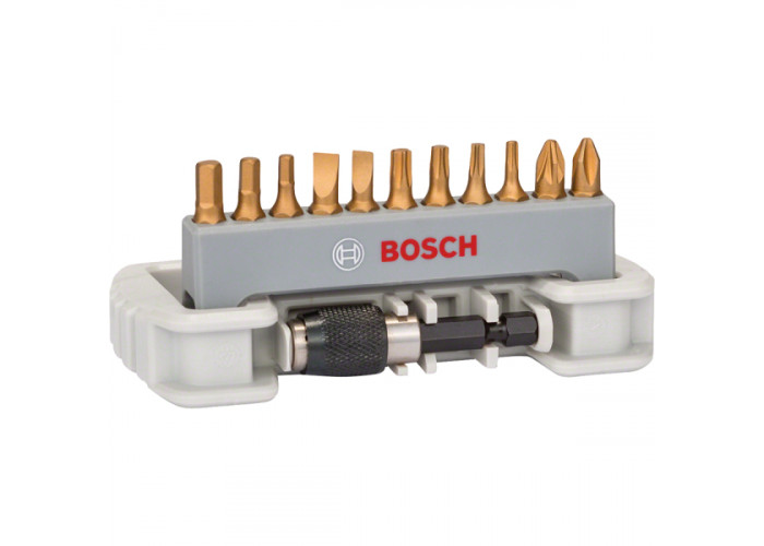 Набор из 11 бит Bosch Compact Max Grip с магнитным держателем. Биты длиной по 25 мм с шлицами PH2, PZ2, T10, T15, T20, T25, S0,6x4,5, S0,8x5,5, HEX3, HEX4, HEX5.