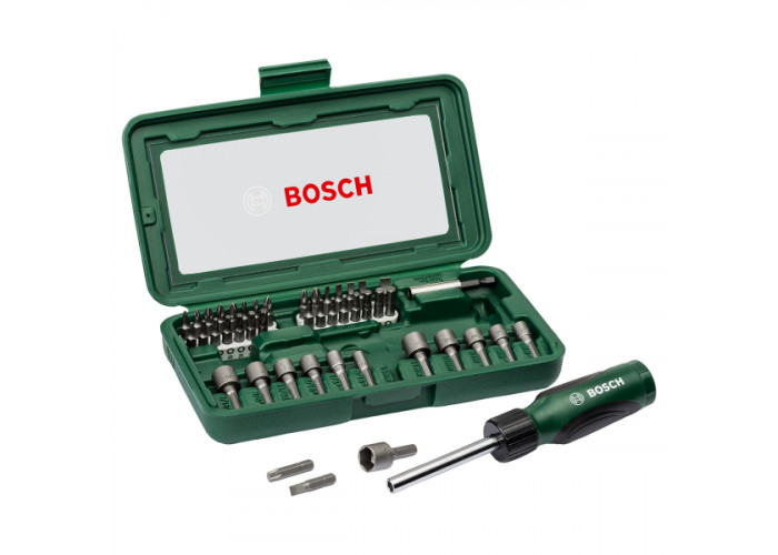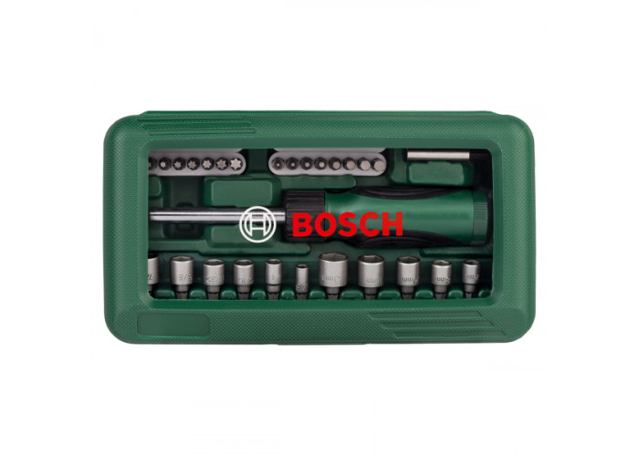 Набір приладдя Bosch PromoLine з 46 предметів: насадки-біти довжиною 25 мм, 12 торцювальних ключів, магнітний тримач, універсальна магнітна викрутка з відсіком для біт у рукоятці. Для виконання різних кріпильний-монтажних робіт. Поставляється у пластиковому кейсі.