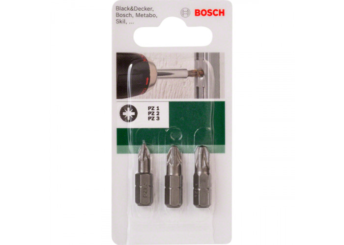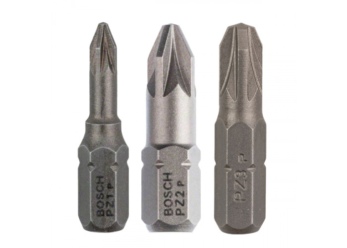 • Набор з трьох насадок-біт Bosch PZ1, PZ2, PZ3 XH довжиною по 25 мм.