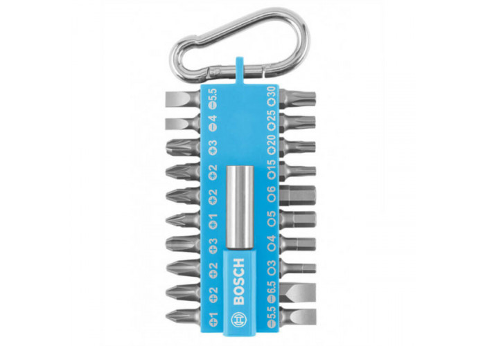 Набір біт Bosch із карабіном і бітотримачем стане у пригоді для робіт із шурупокрутом, дрилем, викрутками. Комплект має різноманітні типи шліців з універсальними розмірами — прямий (SL, номери шліців 4, 5.5, 6), хрестоподібний (PH 1-3 і PZ 1-3), зіркоподібний (Torx 15-30), шестигранний (H 3-6). Загальна довжина біт 25 мм. Вкладені вони з тримачем у пластиковий бокс блакитного кольору, який оснащений карабіном. Всього 21 предмет.