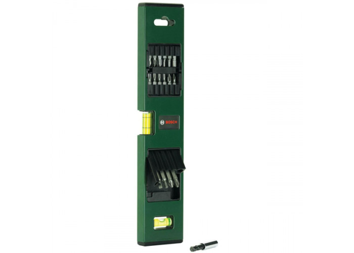 Комплект з 16 біт і тримача розміщений на корпусі будівельного рівня для точного виконання ремонтних робіт.