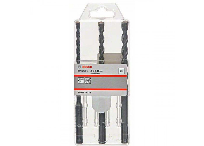 Набор ударных буров Bosch SDS-Plus-1 для высокопроизводительного прохождения бетона, кирпичной кладки. Три бура размерами 6х100х160 мм, 8х100х160 мм и 10х100х160 мм с хвостовиками SDS-Plus.