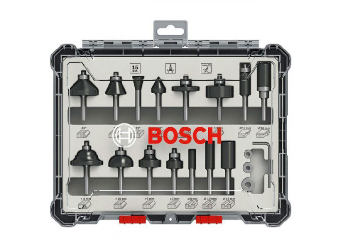 Универсальный набор фрез Bosch в количестве 15 штук с хвостовиком 6 мм. Фреза для выборки заподлицо, шаблонная, фасочная (2 шт) фрезы, «ласточкин хвост», V-образная пазовая, дисковая пазовая, для выборки паза, кромочная, 2 карнизные, фреза для фасочной римской калевки, 2 прямые фрезы с двумя зубцами и прямая фреза с 3 зубцами. Также в набор входят шестигранный ключ и три подшипника.